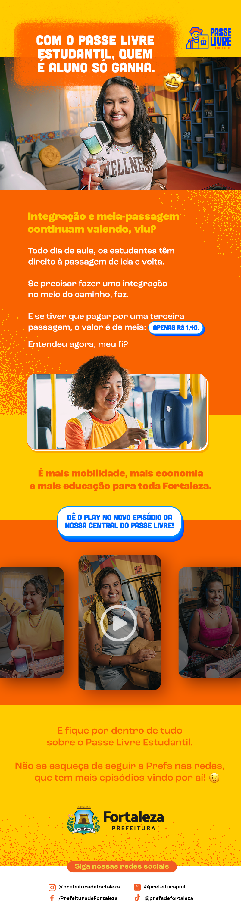 fortaleza foi a primeira capital do brasil a disponibilizar o passe livre estudantil para todos os estudantes. quando esse trabalho chegou à nossa mesa na usina o pedido oficial do cliente era um carrossel falando sobre este novo serviço. eu como um ex-militante do movimento passe livre em natal (rn) vi ali uma oportunidade de irmos além. pensando nas dúvidas que as pessoas da cidade tinham em relação à novidade, desenvolvemos uma central de atendimento diferente: cheia de bom humor e em bom cearenses para ninguém mais ficar em dúvida na hora de usar o passe livre estudantil.