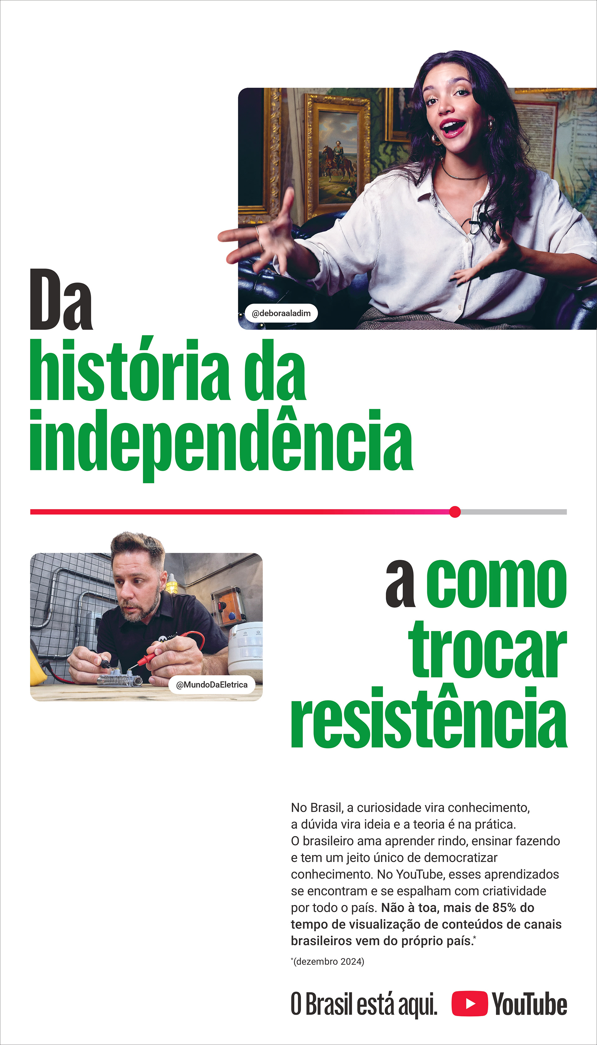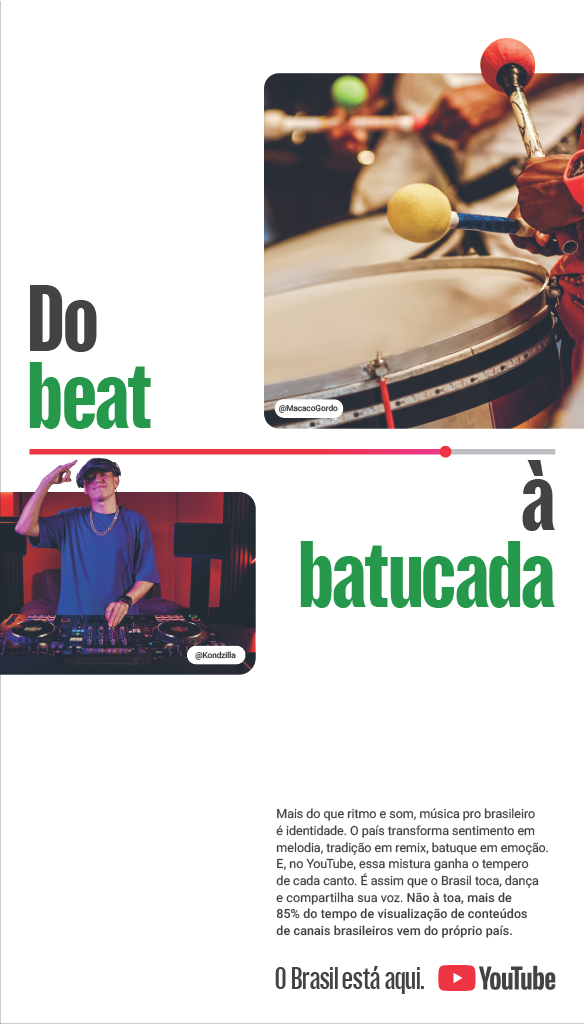 A gente precisava mostrar que a diversidade brasileira se faz presente no YouTube da maneira mais real e possível. Aquele lance de Brasil profundo, saca? Pra isso, trouxemos perfis grandes, médios e pequenos para participarem de uma campanha, ao som de um jingle cheio de ginga produzido em parceria com o kondzilla.